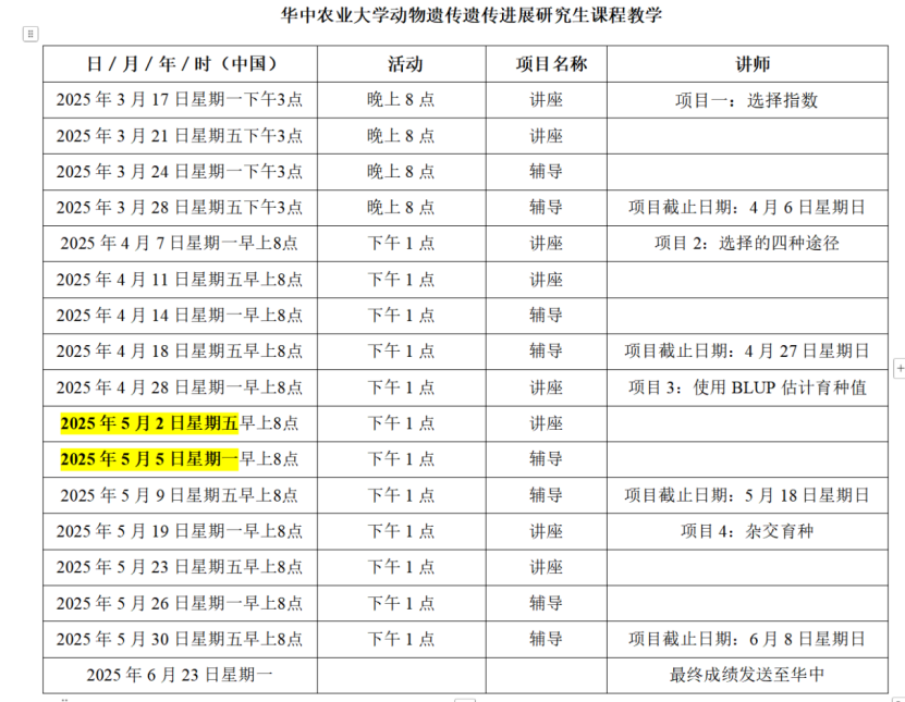 Course Details: - Course Name: Advances in Animal Genetics and Breeding - Instructor: Experts from Massey University - Teaching Method: Online teaching - Class Duration: Each class will last 1 - 1.5 hours- Class Credits: 3 credits