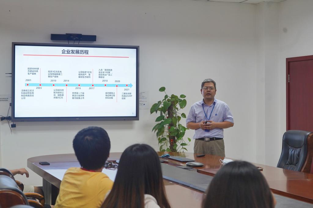 赴湖北省宜昌、荆州、武汉市暑期社会实践团来到武汉科前生物股份有限公司参观交流,董事长助理刘继东与实践团成员进行交流。