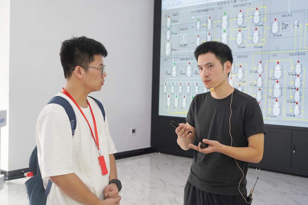 在产业区的一楼大厅里,徐老师向实践团展示了科前生物智能制造车间的建设蓝图,并详细讲解产区的自动化流程,充分展现出新时代背景下企业发展模式逐步向高质量发展转变的趋势。他强调,目前的生产车间基本全部采用自动化模式,从细胞悬浮到产物纯化、分装,皆向标准化、智能化发展,这有助于推动科研成果产业化,用创新科技创造价值,争做生物医药行业标杆引领产业高速新发展。