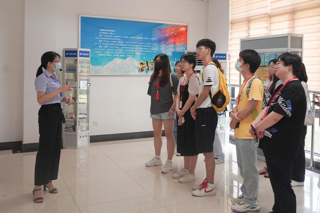 7月4日上午,实践团首先来到科前生物公司的陈列室。讲解员围绕“企业简介、发展历程、性爱网、研发产品与专利、重点研究领域、制造与品控、营销、服务”等多方面带领实践团成员们领略科前风采。