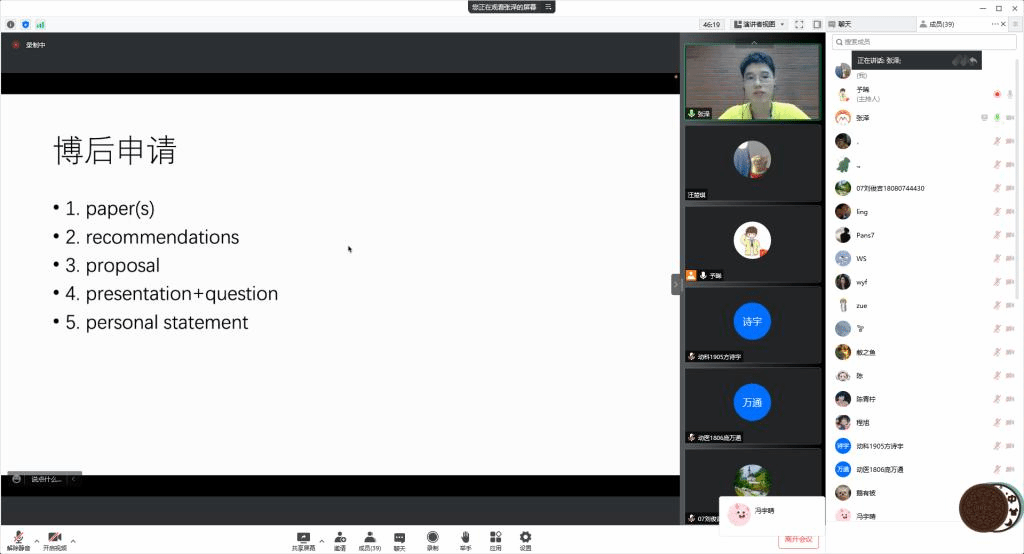 张泽的分享交流立足自身实际,在与会同学中引起热烈反响。与会同学们对张泽的分享交流表示衷心感谢,并就“科研与学生工作之间的关系”“申请北生所研究生的面试流程与北生所的科研环境”“如何选择适合自己的博后位置”等问题与张泽展开长时间的积极互动。张泽表示,希望同学们都能有所收获,学有所成,在各自擅长的领域发光发热,为我国的科学研究奉献青春、贡献力量。